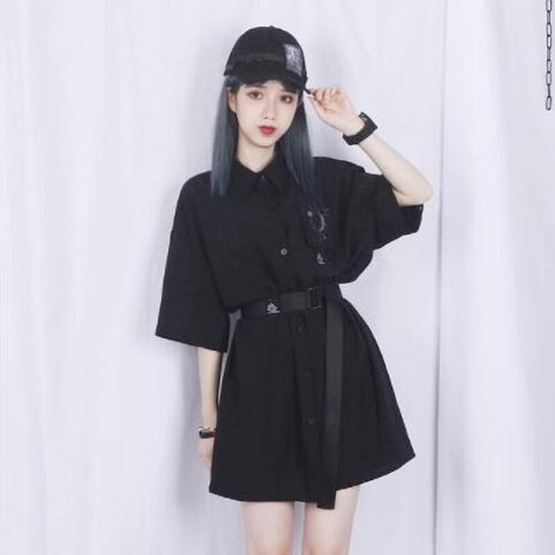 サブカル 服 地雷系 通販 ロングシャツ シャツワンピ 2Way 切替え オールインワン 黒 白 闇かわいい ゴシック JK