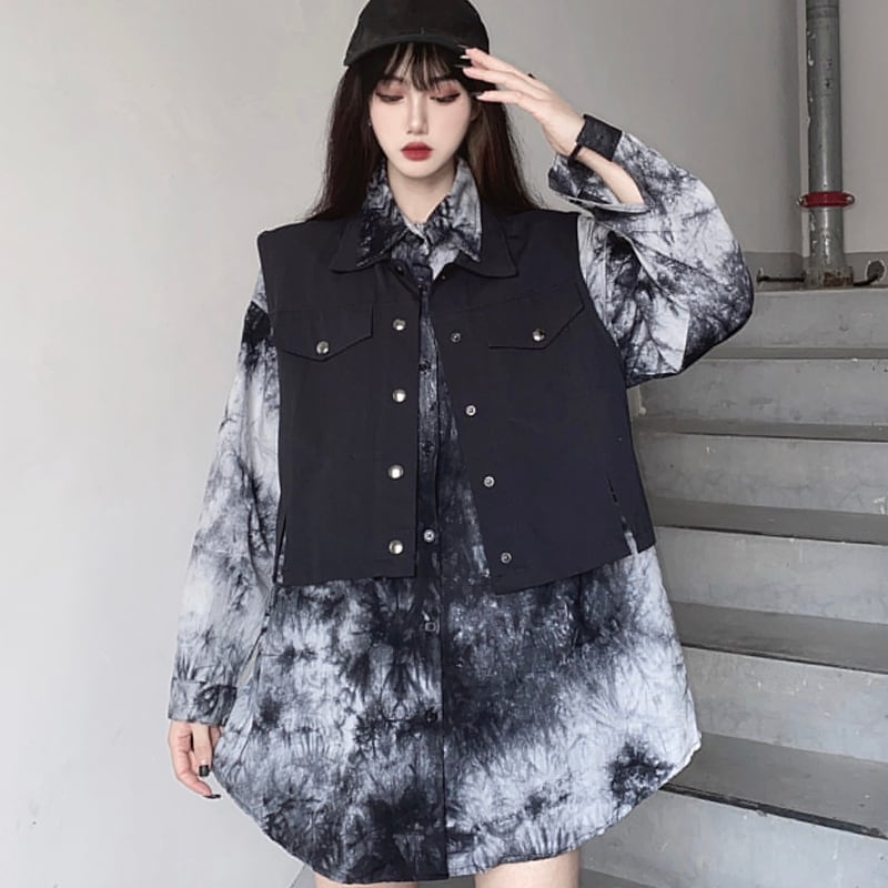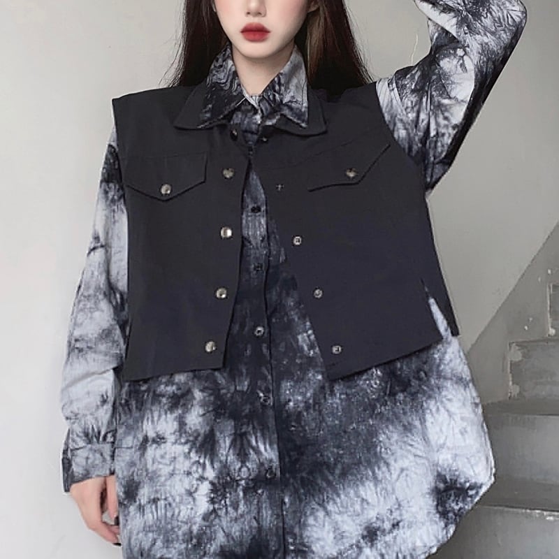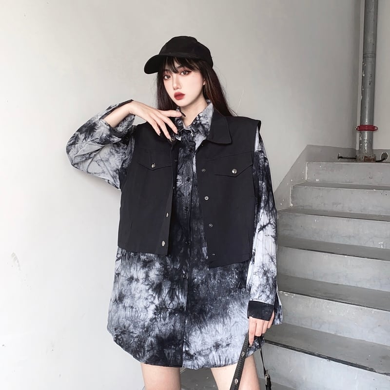 サブカル 服 地雷系 通販 ツーピース 長袖シャツ ベスト 絞り染風 闇かわいい ゴシック レトロバンギャ