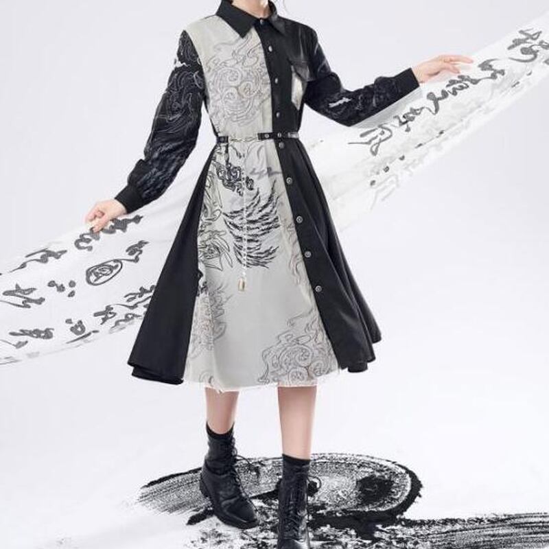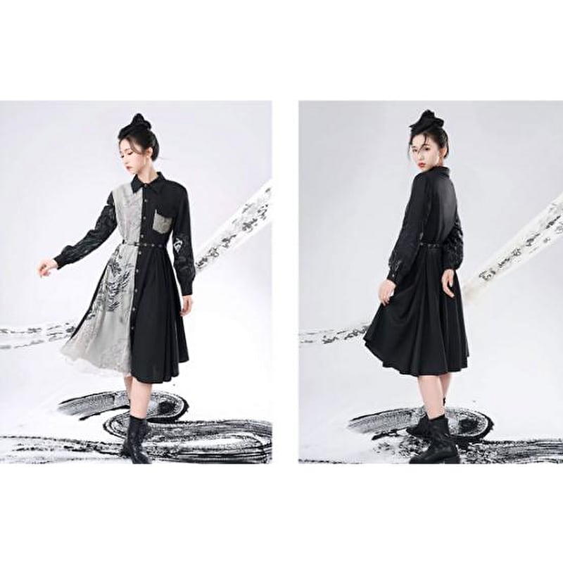 サブカル 服 地雷系 通販 ワンピース バイカラー レトロ チャイナ服 中華服 ミドル丈 ウエストベルト付き 闇かわいい ストリート系