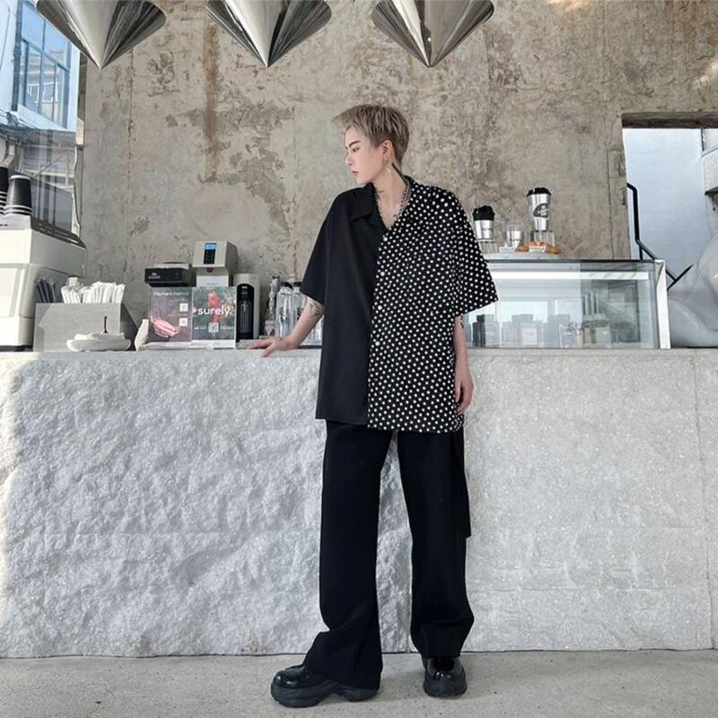 黒地に水玉模様のバイカラースタイルがかっこいいストリート系シャツです