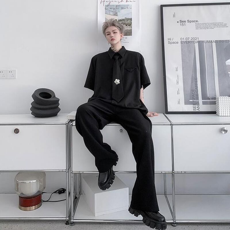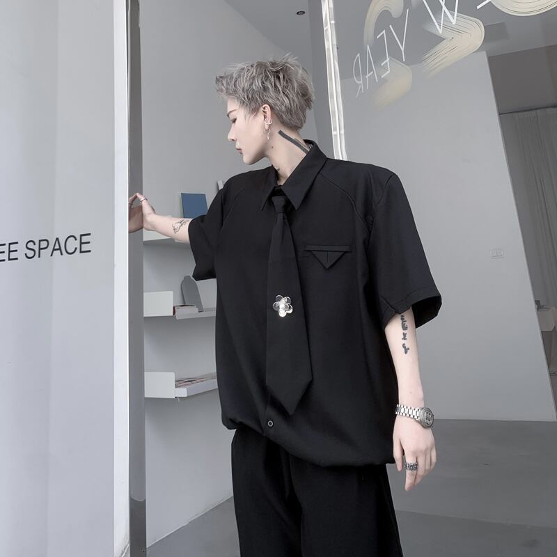 サブカル 服 地雷系 通販 メンズ 半袖シャツ モノトーン ネクタイ付き デザインシャツ クール かっこいい オーバーサイズ ビッグシルエット