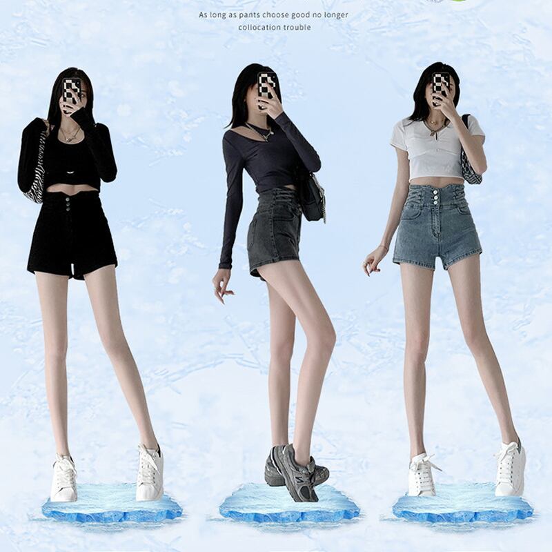 ハイウエストなかさ上げデザインに三つボタンのデニムホットパンツ