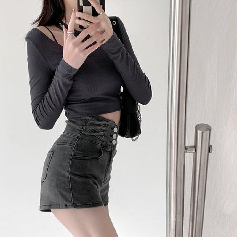 サブカル 服 地雷系 通販 デニム ホットパンツ ハイウエスト 三つボタン カジュアル かわいい