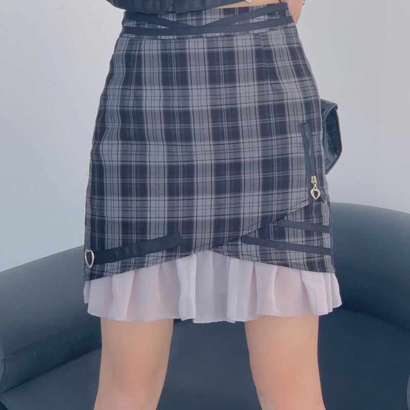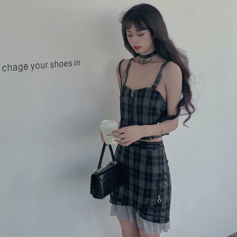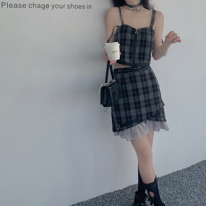 チェック柄のサスペンダーキャミソールとミニラップスカートの上下セット