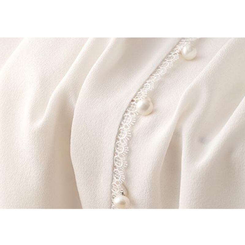シルクの優しい肌触りに上品なフェイクパールボタン、ネックギャザーが大人可愛い