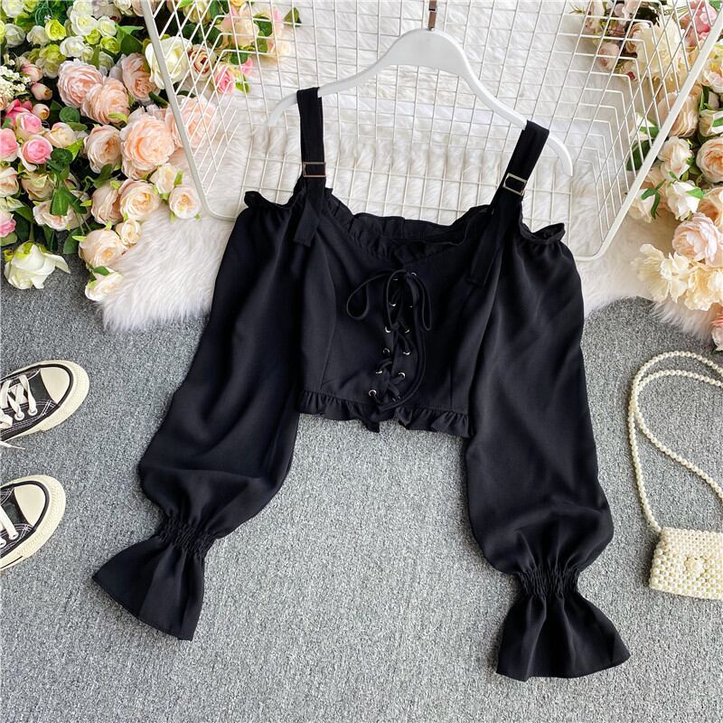 サブカル 服 地雷系 通販 SEASONZ ブラウス ミニ丈 V字 編み上げ ショルダーストラップ オフショル 袖コン 闇かわいい ゴスロリ バンギャ