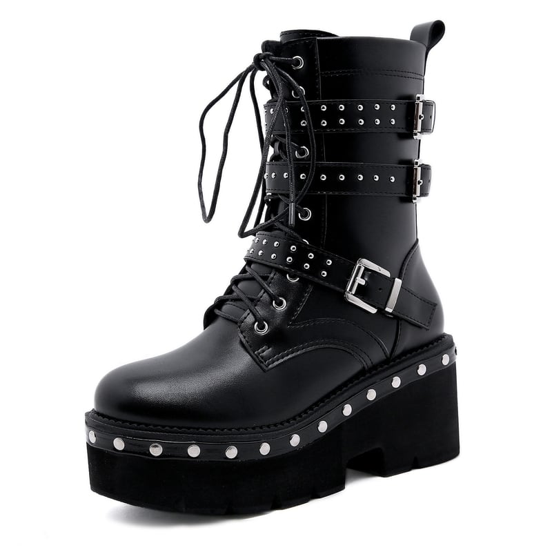 サブカル 服 地雷系 通販 厚底ブーツ サイドZIP 編み上げ リベット メタル 3連トリプルベルト ヒール高8cm つま先5cm 筒高18cm Dark gothic 暗黒系 闇かわいい