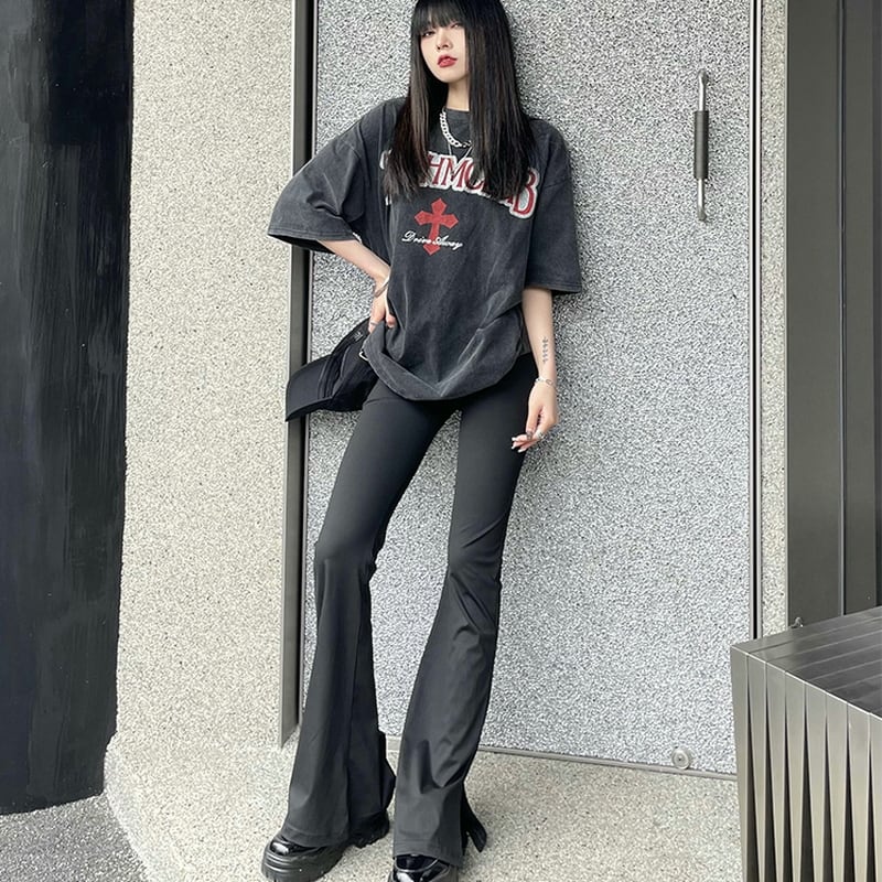 サブカル 服 地雷系 通販 夏 半袖Tシャツ レトロ ウォッシュド加工 オーバーサイズ ユニセックス バックロゴ 暗黒系 闇かわいい