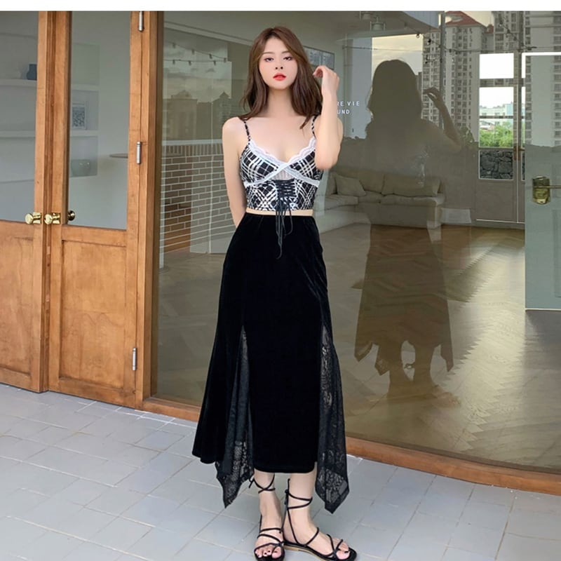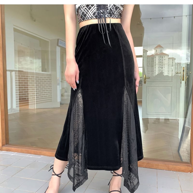 サブカル 服 地雷系 通販 スカート ロング丈 スリット入り レース ハイウエスト ベルベット 闇かわいい ゴシック