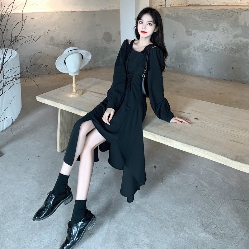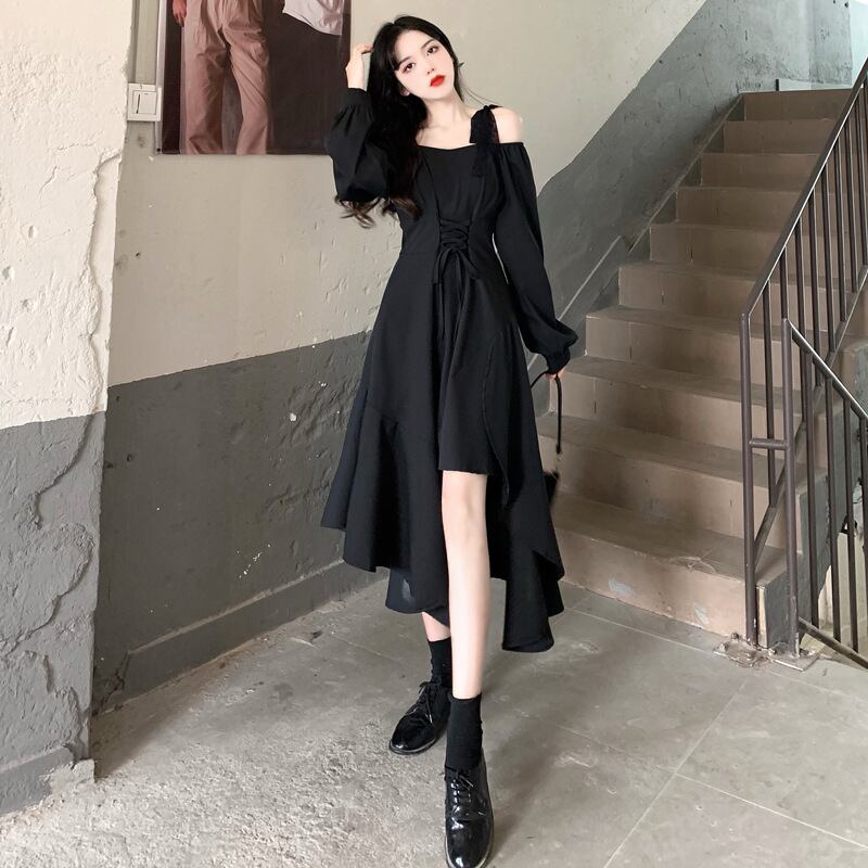 サブカル 服 地雷系 通販 ワンピ ハイウエスト 編み上げ オフショル アシンメトリー ロング丈 闇かわいい ストリート系バンギャ