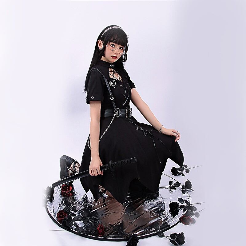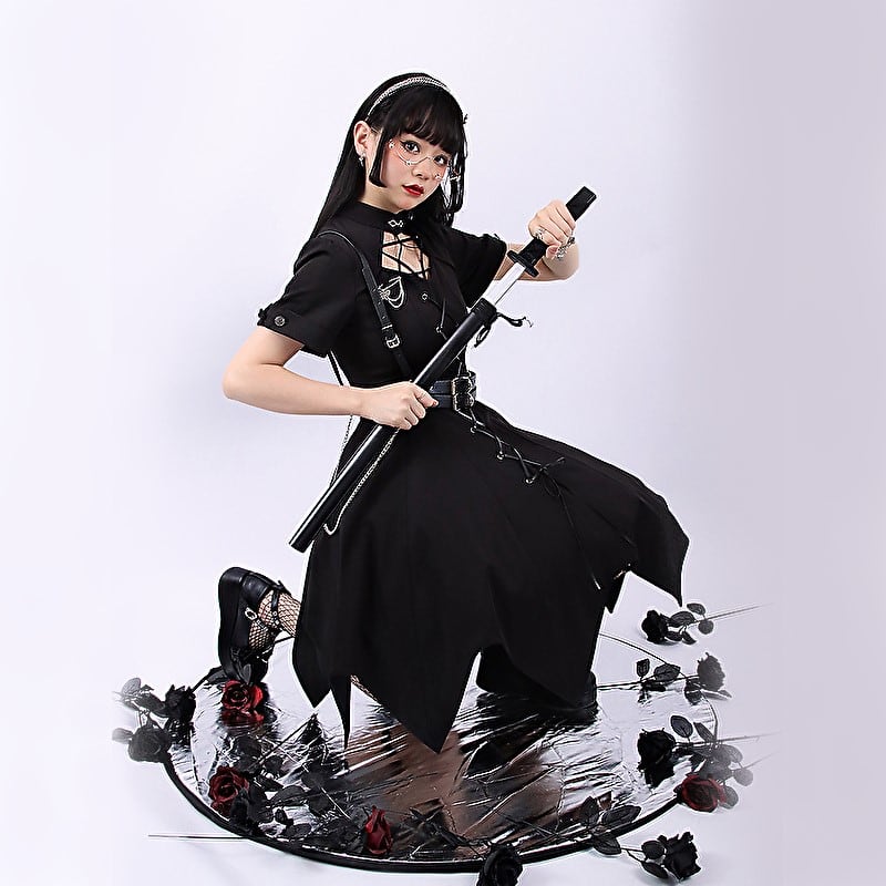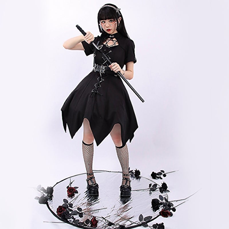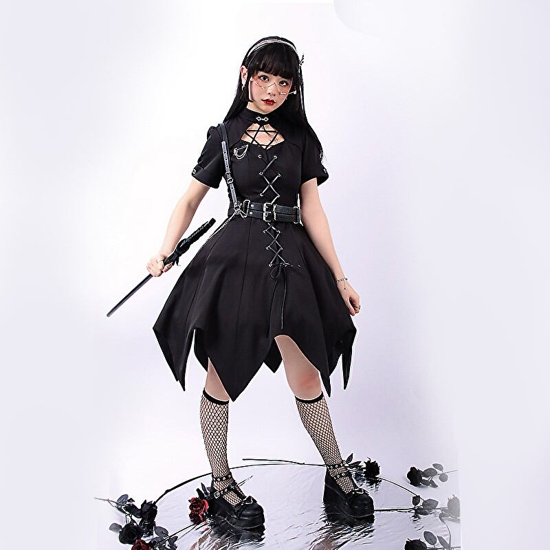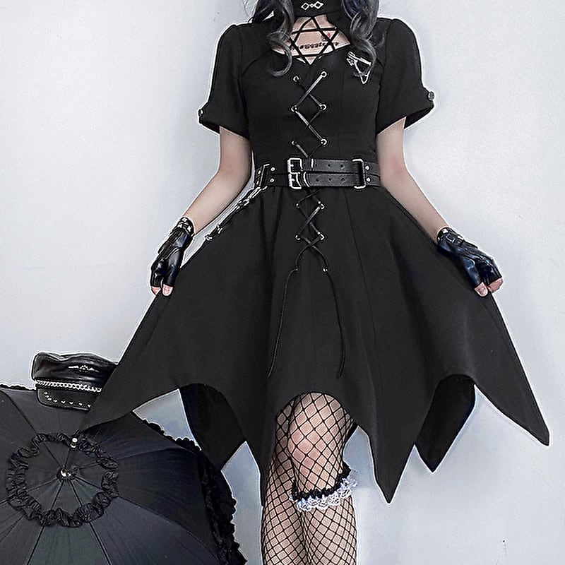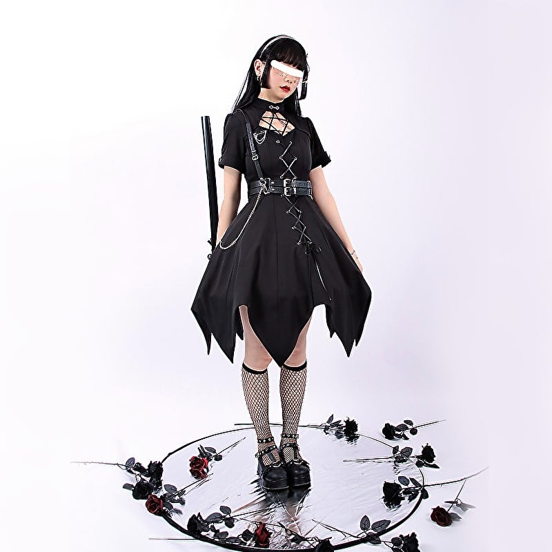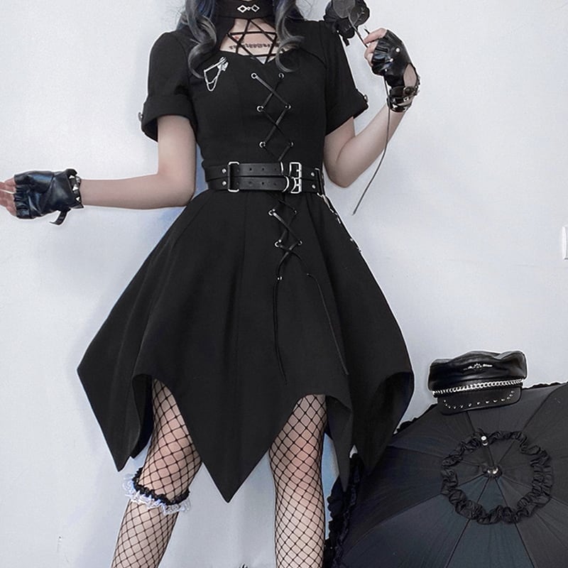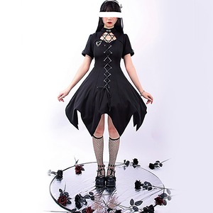 アシンメトリーなミドル丈にレースアップが可愛いサブカル半袖ワンピ