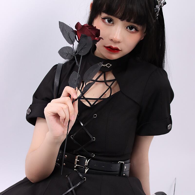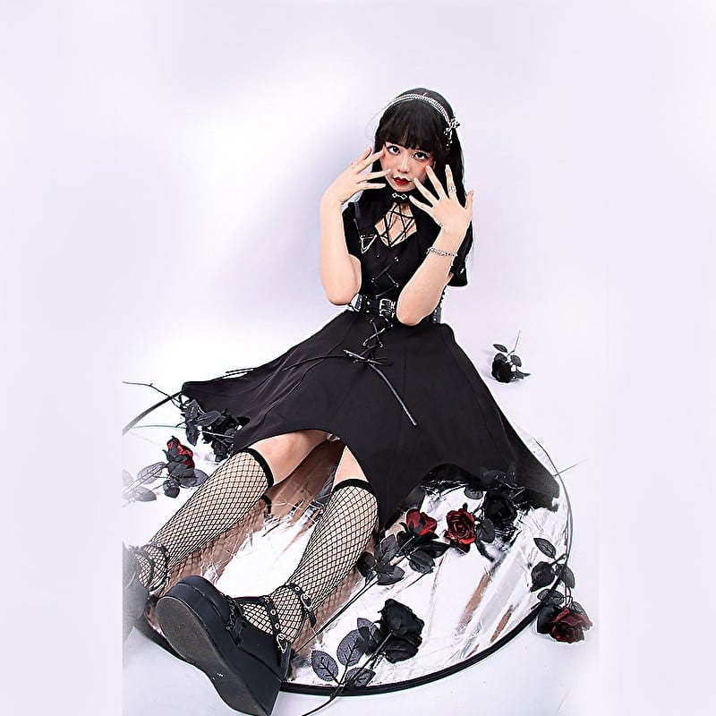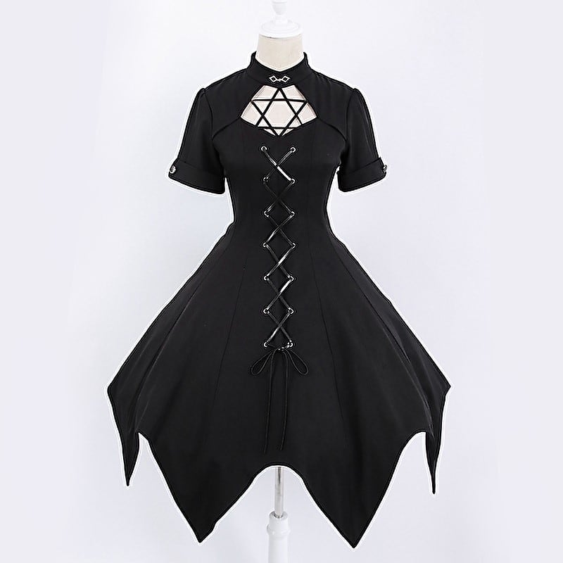 ハイウエスト、細見えのデザイン、デコルテの五芒星がビジュアル抜群なゴシック半袖ワンピです
