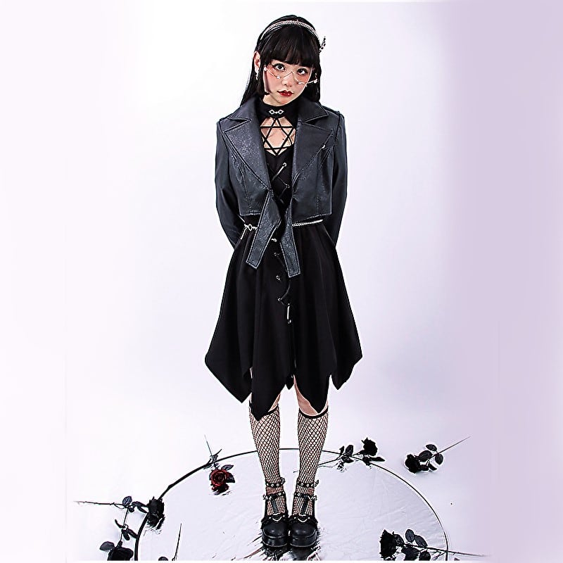 サブカル 服 地雷系 通販 ワンピ 半袖 五芒星 アシンメトリー 編み上げ ハイウエスト ゴシック 闇かわいいバンギャ