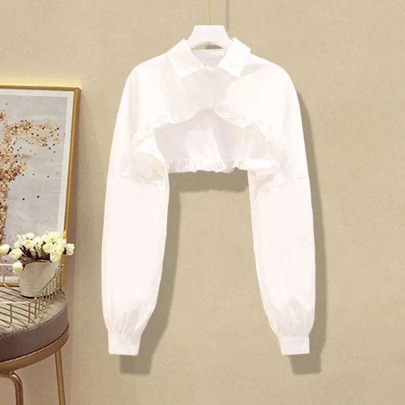 ヘルシーなショート丈ブラウスにジャンパースカートの上下セットです