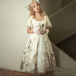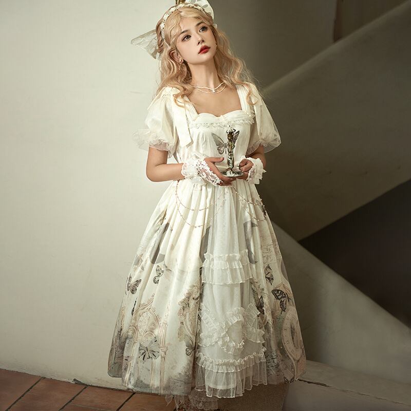 サブカル 服 地雷系 通販 ワンピ 半袖 ゴスロリ butterfly プリント ハイウエスト レトロ ロリィタ フリル レース量産型