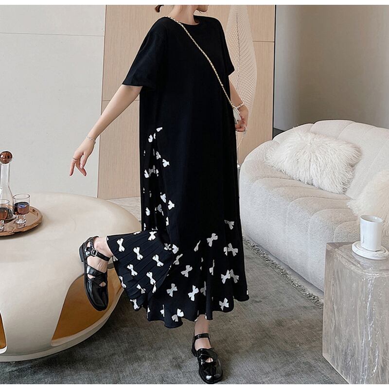 サブカル 服 地雷系 通販 ワンピ 半袖 プリーツ ロング丈 リボンプリント柄 大人可愛い ゆったり カジュアル 大人 モードファッション