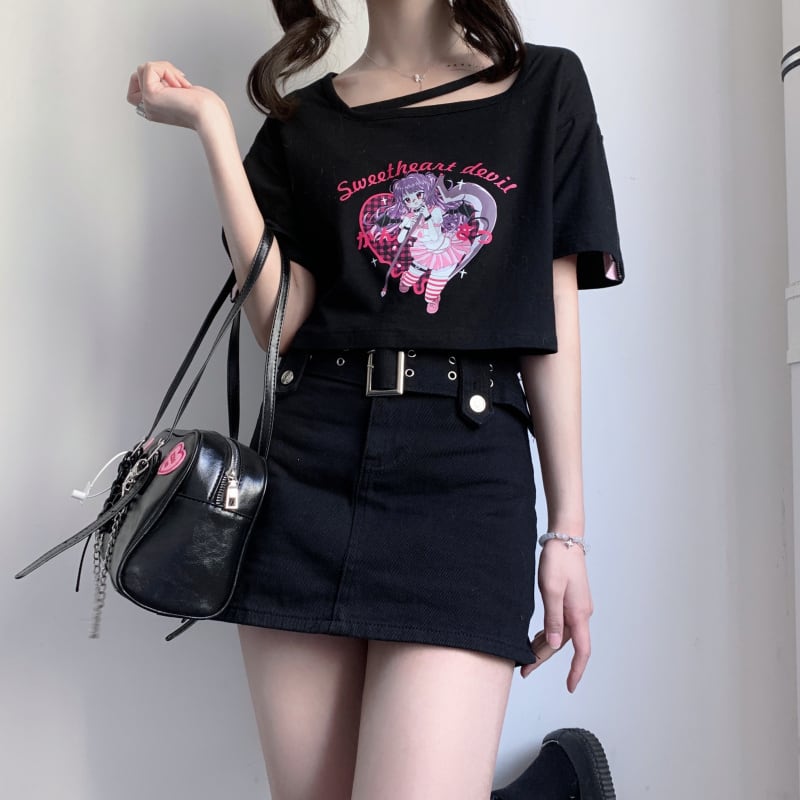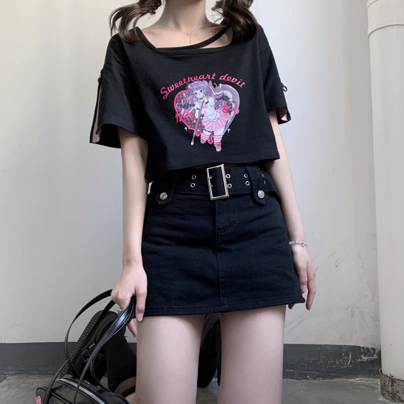 サブカル 服 地雷系 通販 Tシャツ 半袖 袖ZIP ショート丈 プリント柄 英字ロゴ 甘め