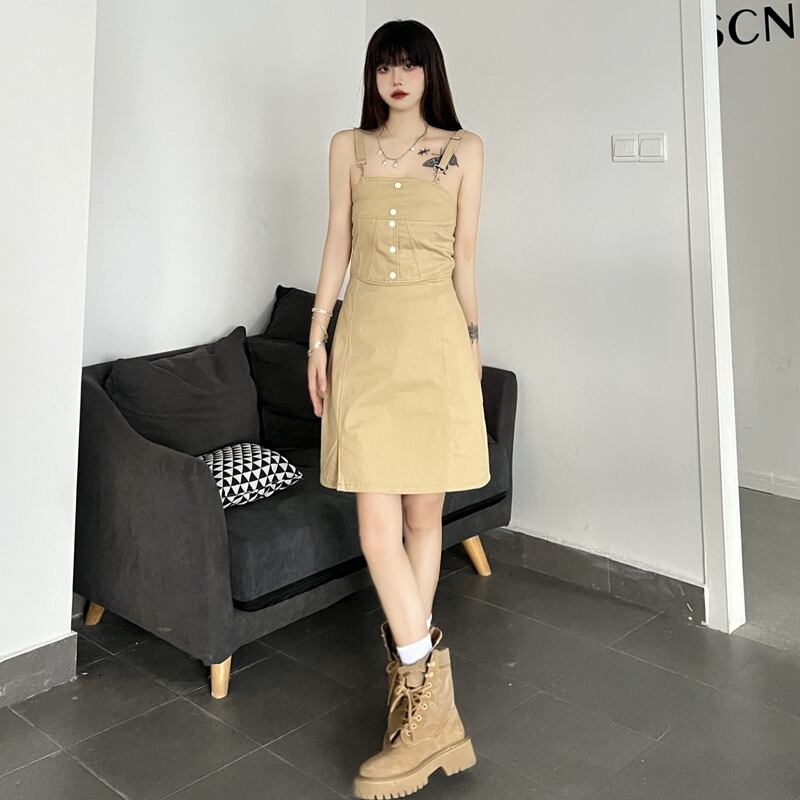 ZIPアップの半袖シャツとヘルシーなミニ丈のサスペンダースカートのツーピース上下セットです