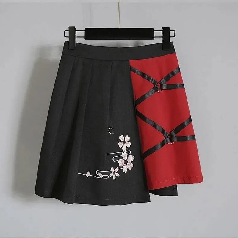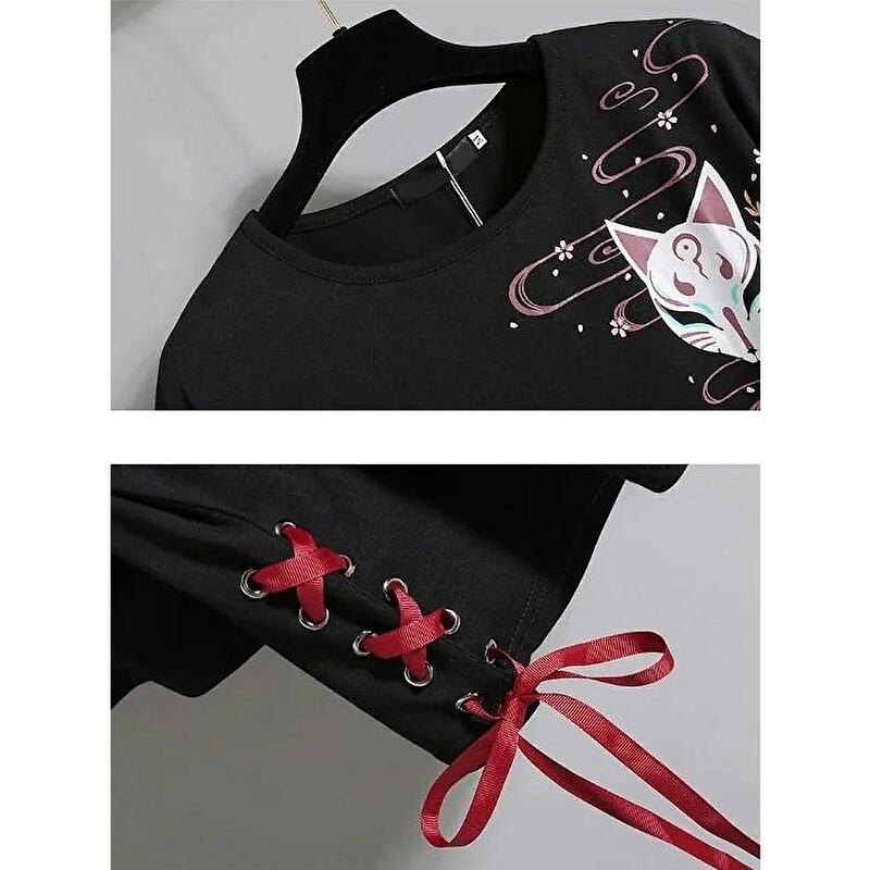 サブカル 服 地雷系 通販 ツーピース チャイナ服 中華服 半袖 Tシャツ プリーツスカート キツネ面 刺繍 闇かわいい