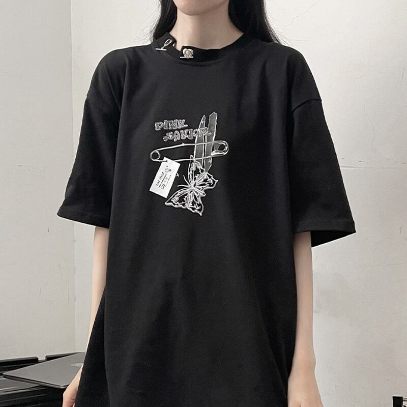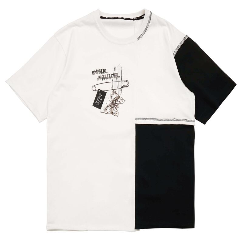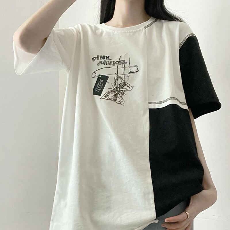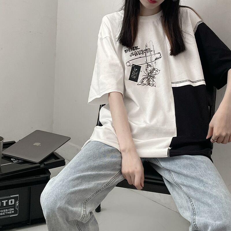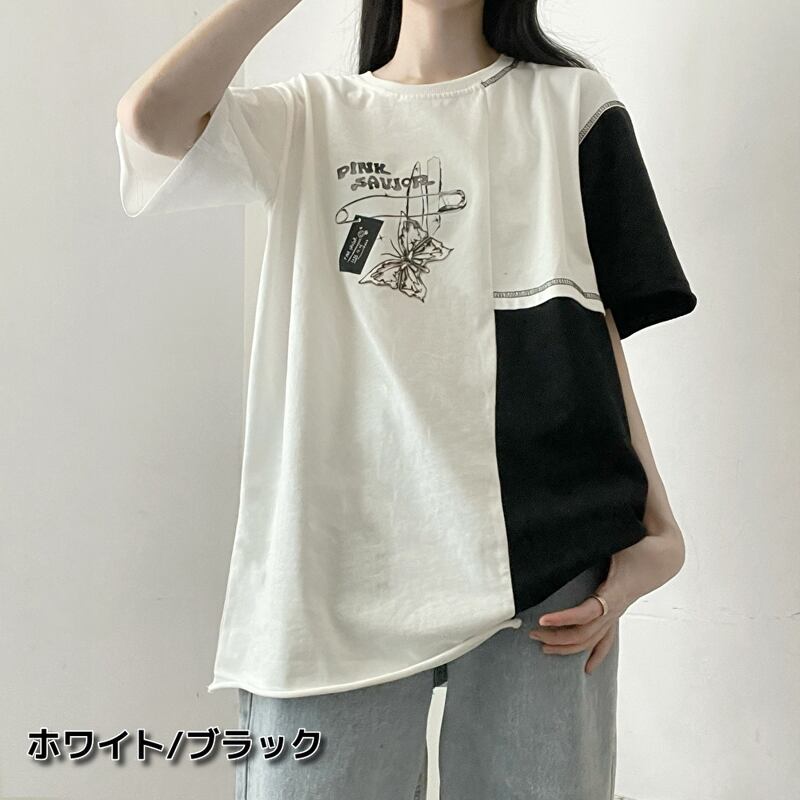 サブカル 服 地雷系 通販 Pinksavior バイカラー 半袖 Tシャツ butterfly ワンポイント プリント柄 カジュアル