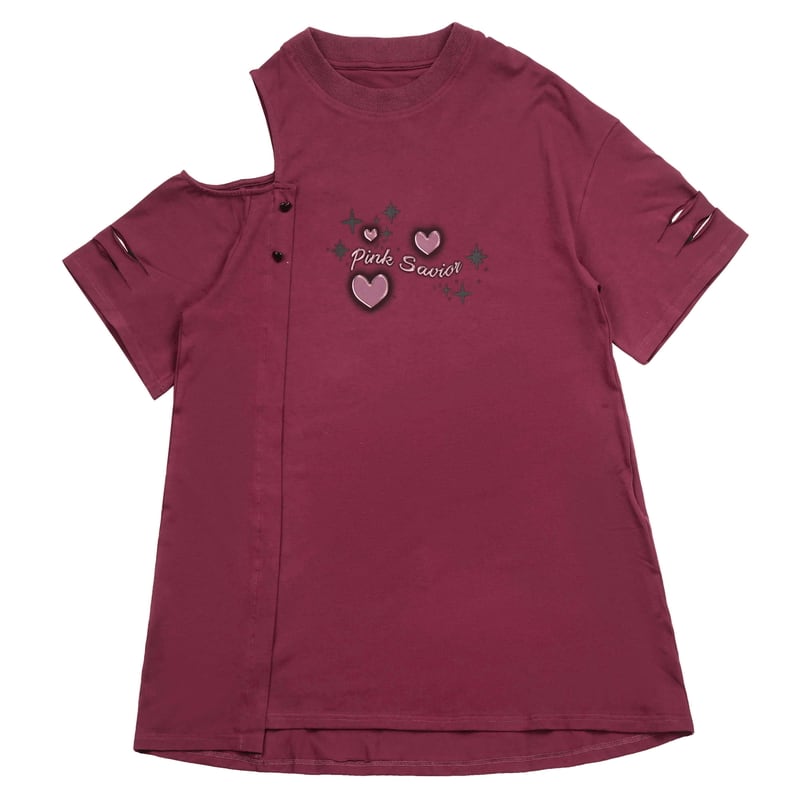 サブカル 服 地雷系 通販 Tシャツ 半袖 ワンショルダー ハート プリント柄 ゆったりサイズ JKスタイル かわいい