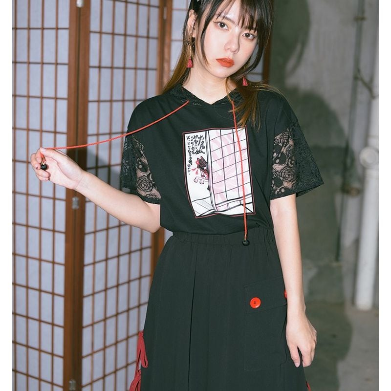 サブカル 服 地雷系 通販 チャイナ風服 チャイナ風服 古怪舎 スカート ミモレ丈 アシンメトリ リボン レース シアー素材 かわいい ストリート 中華服 チャイナ服 普段使い