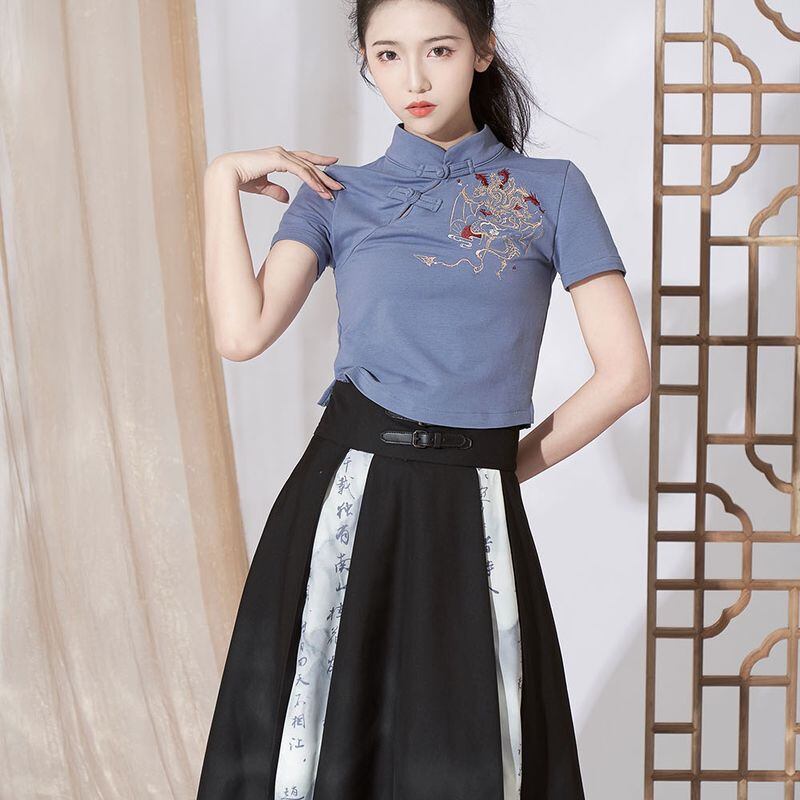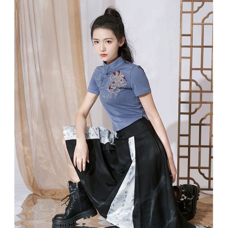 サブカル 服 地雷系 通販 チャイナ風 ヘムスカート 膝丈 漢字 漢文 プリント かわいい かっこいい ベルト Aライン ハイウエスト