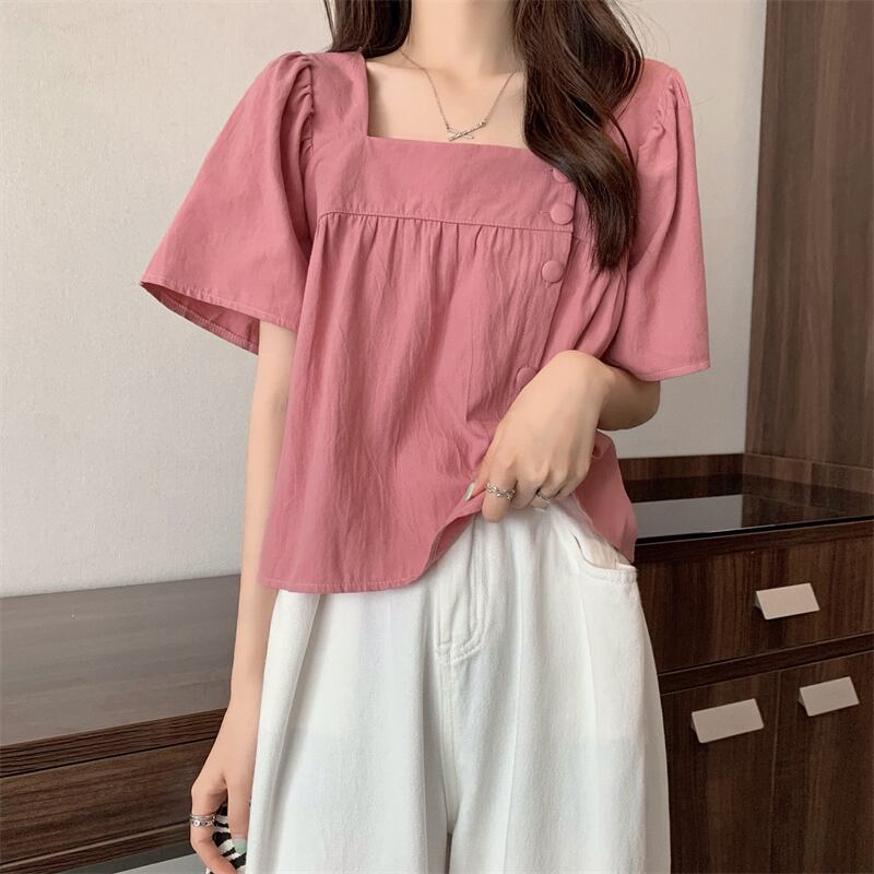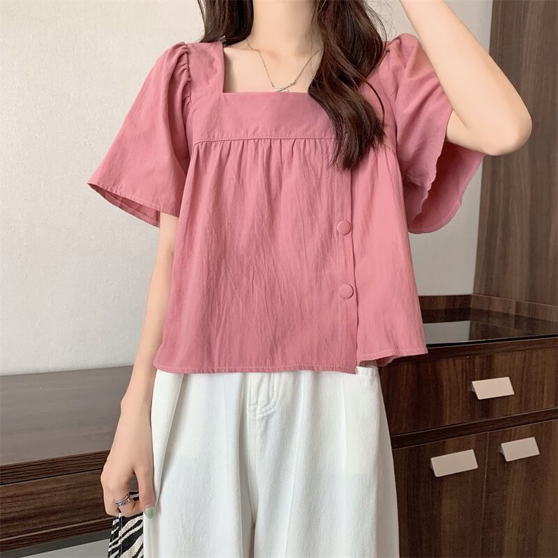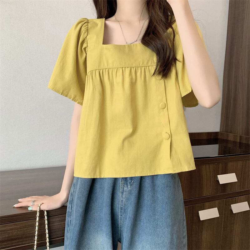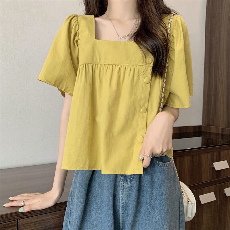 サブカル 服 地雷系 通販 シャツ 半袖 スクエアネック ビタミンカラー サイドボタン ガーリー 甘め 量産型 かわいい カジュアル