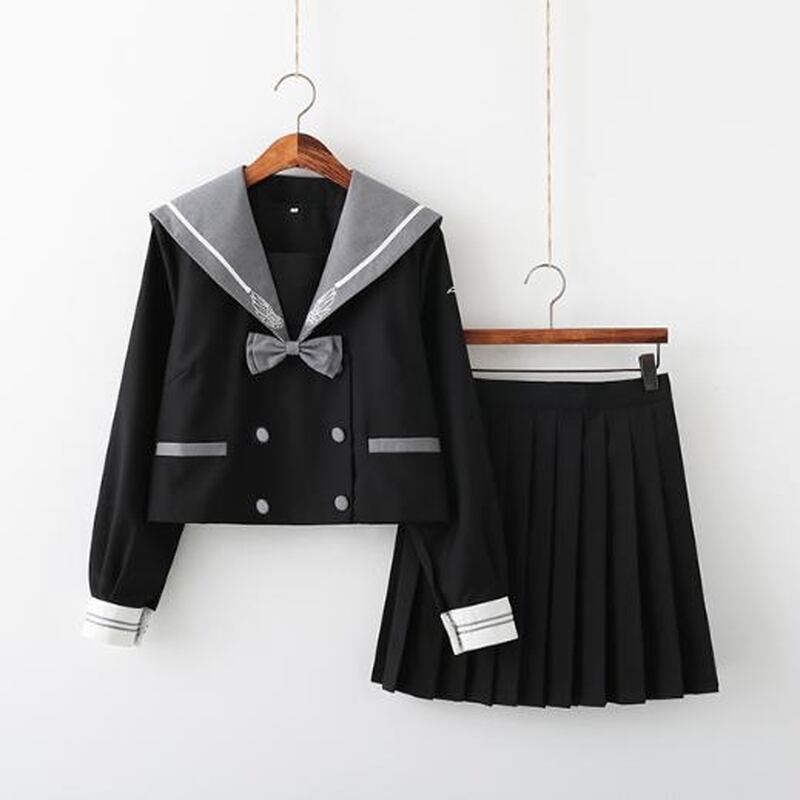 襟カラーはおしゃれな鳥のデザイン、リボンに靴下が付属するオールインワンのセーラー服です