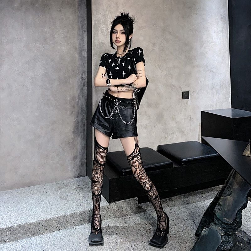 サブカル 服 地雷系 通販 トップス 半袖 ショート丈 腹出し へそ出し 十字架柄 クロス パンク系 ロック系 バンギャ