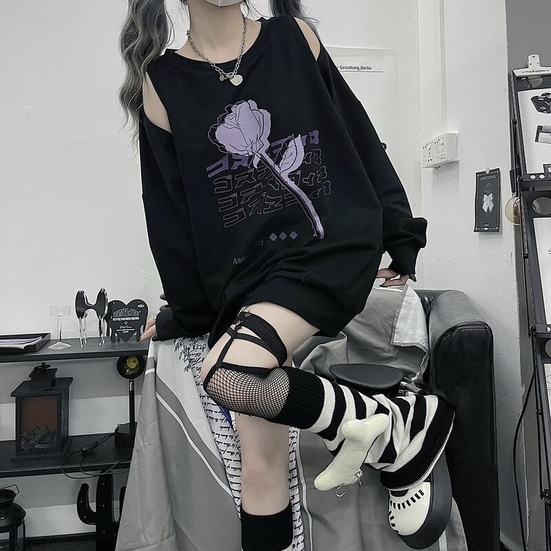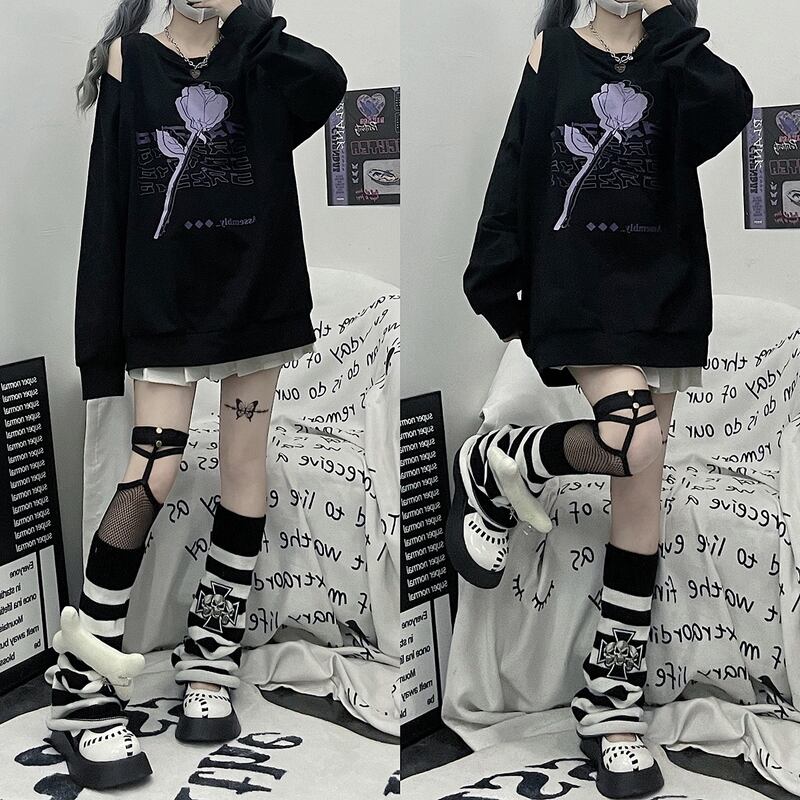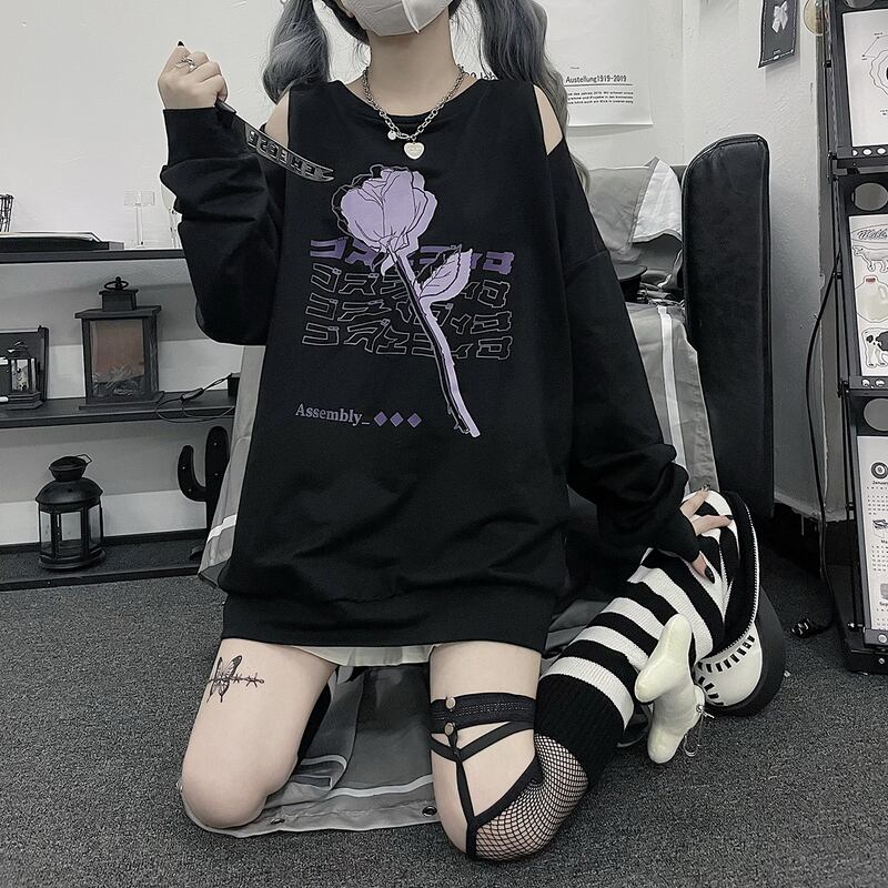 サブカル 服 地雷系 通販 CRAZYGIRL 長袖 トレーナー オフショル 薔薇 プリント JKスタイル 甘め かわいい ロリータ