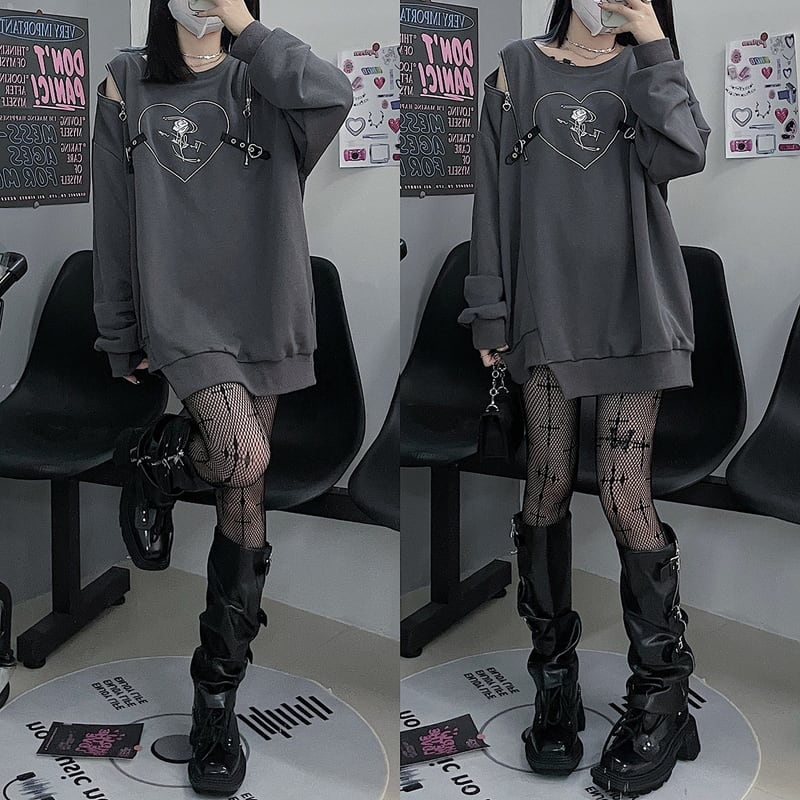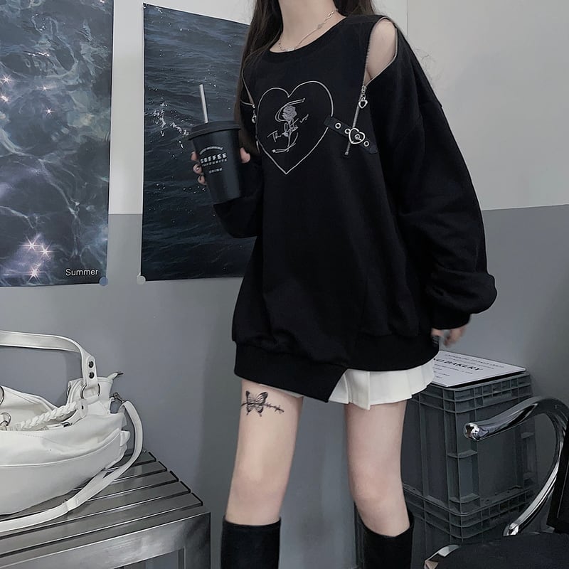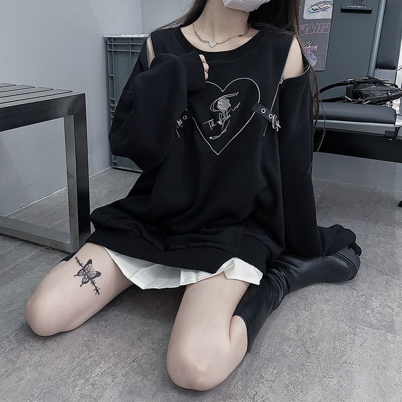 サブカル 服 地雷系 通販 CRAZYGIRL 長袖 トレーナー ショルダー ZIPアップ ワンポイント ハート 薔薇 異形 裾丈 JKスタイル 甘め かわいい ロリータ