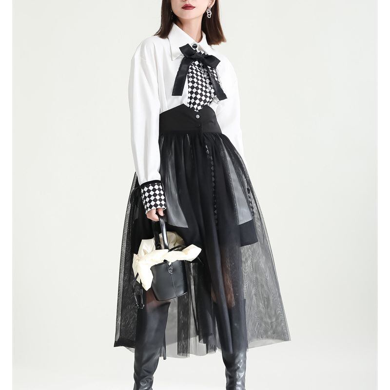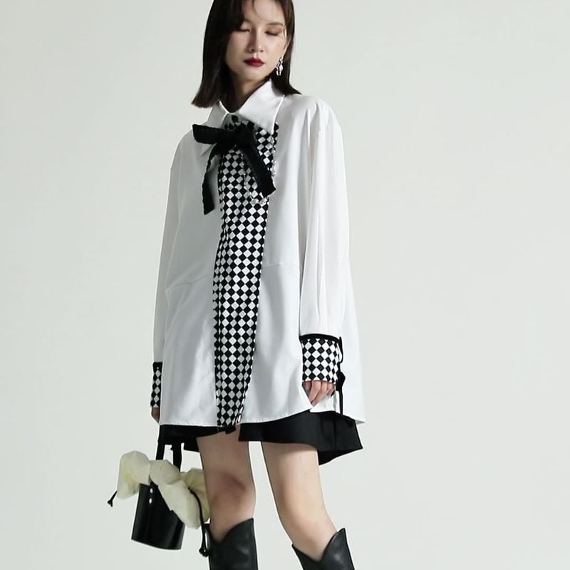 サブカル 服 地雷系 通販 モード服 中創日韓 シャツ ブラウス リボン チェック柄 市松模様 長袖 ツートン