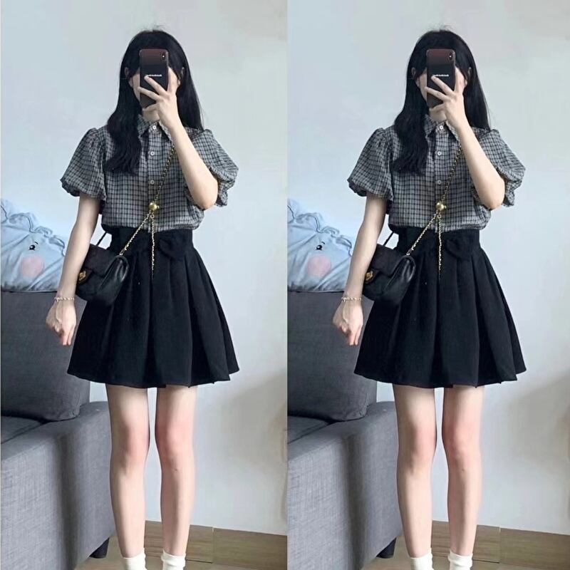チェック柄のパフスリーブの半袖シャツにプリーツミニスカの上下セットです