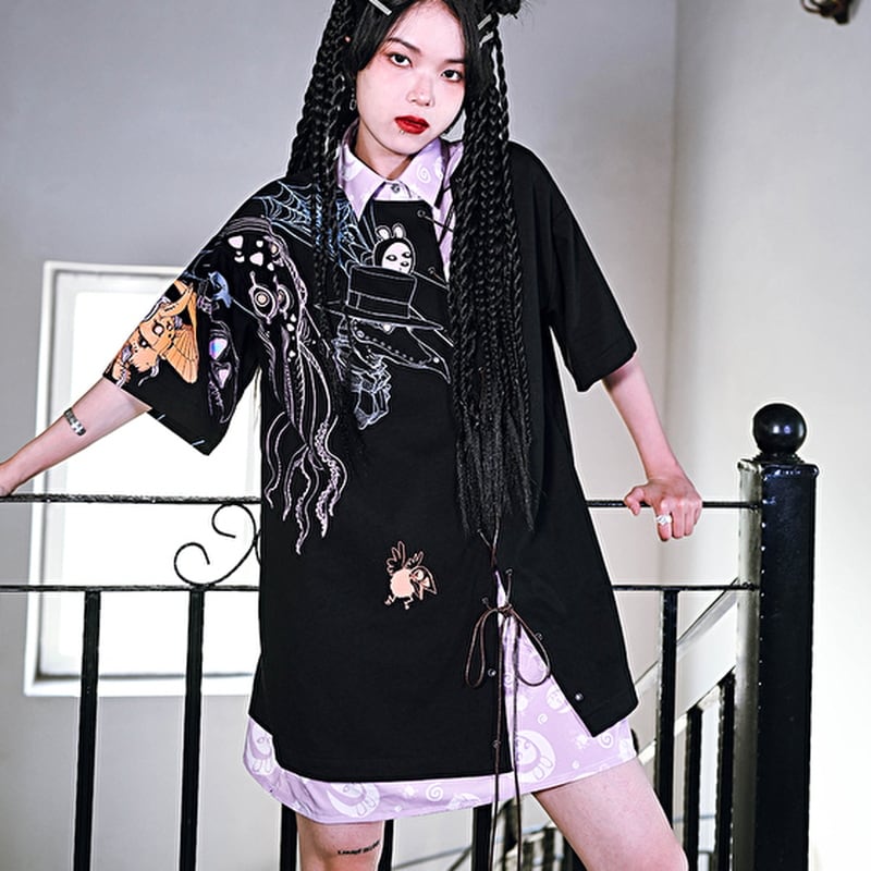 サブカル 服 地雷系 通販 チャイナ風服 チャイナ風服 古怪舎 フェイク シャツワンピ 半袖 妖怪 怪物 プリント柄 闇かわいいストリート系バンギャ 中華服 チャイナ服 普段使い