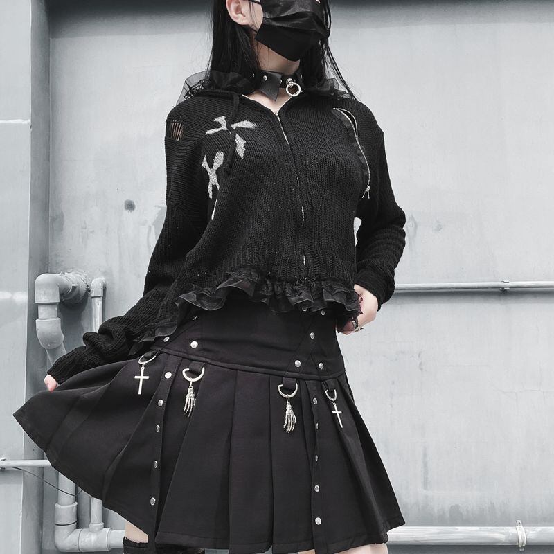 十字架とスカルハンドのチャームがポイントのパンク系ミニ丈プリーツスカートです。