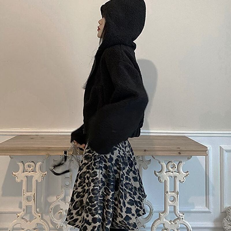 ベルト付きのタートルネックトップスとショート丈のヒョウ柄スカートのセットです。