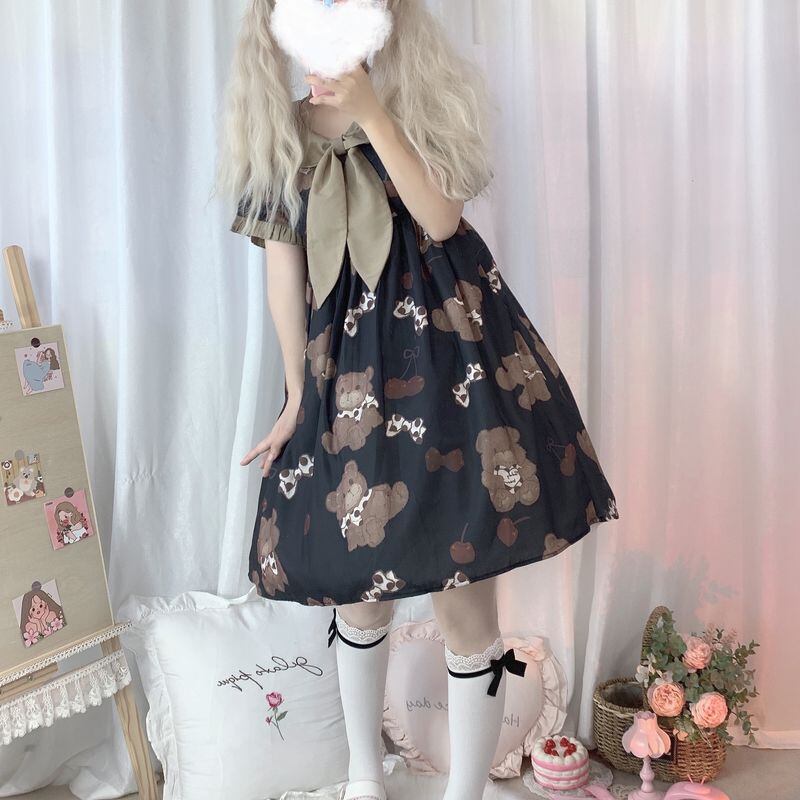 テディベアとさくらんぼがプリントされたロリータ系半袖ワンピースです。