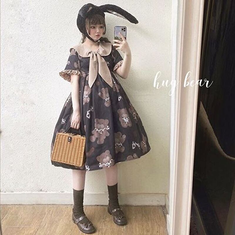 サブカル 服 地雷系 通販 ワンピース 半袖 テディベア くまちゃん チェリー 柄 プリント スモークカラー くすみカラー ロリィタ かわいい