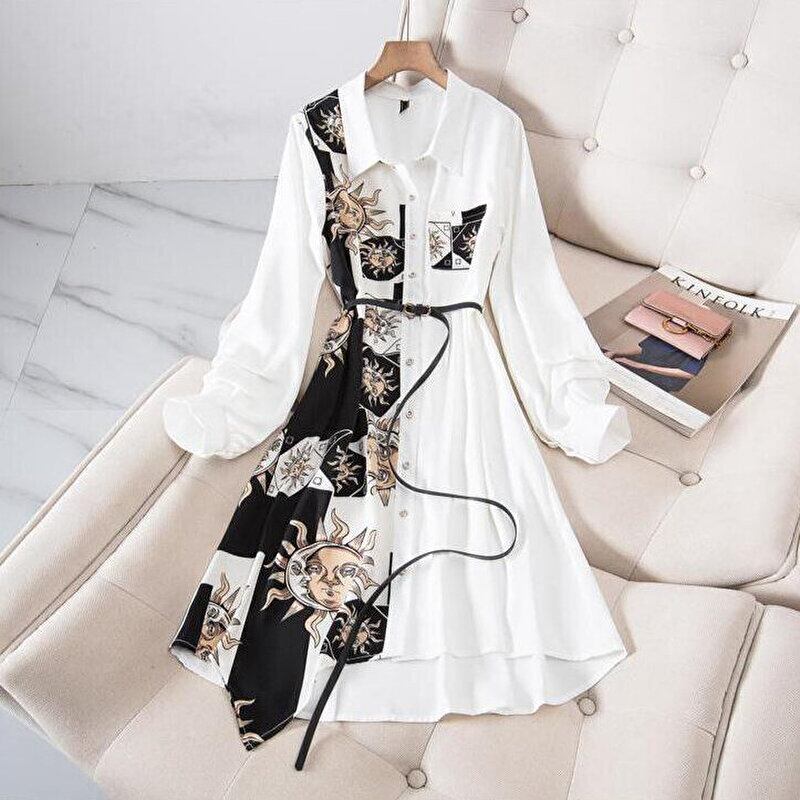 サブカル 服 地雷系 通販 モード服 シャツワンピ 長袖 ベルト付き アシンメトリ ゆったり 太陽 柄 プリント モード系 おしゃれ