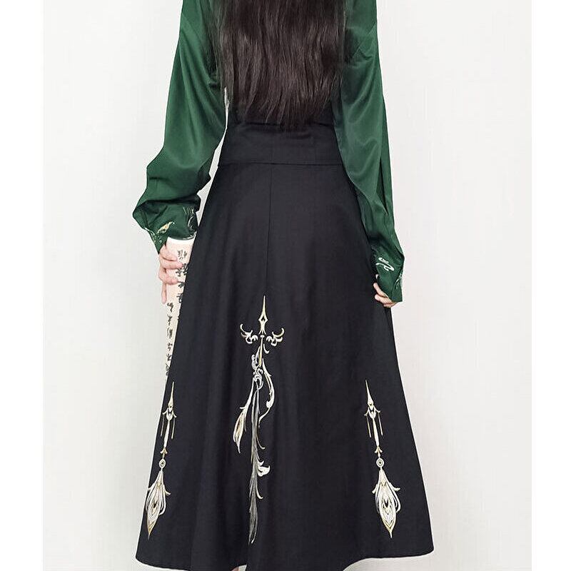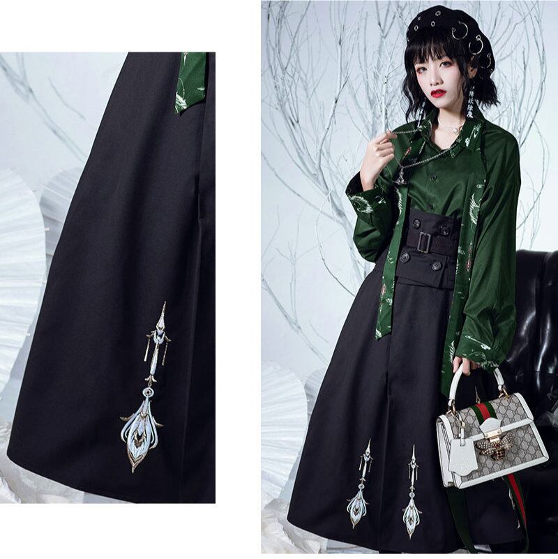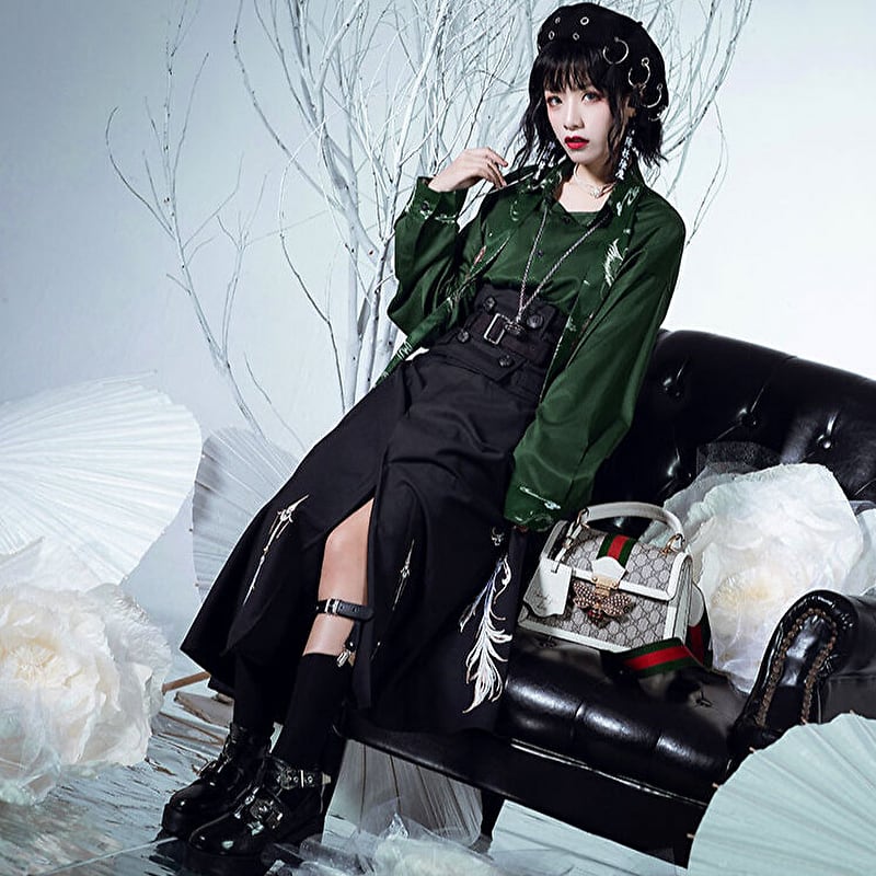 サブカル 服 地雷系 通販 ロング巻きスカート スリット ミモレ丈 ベルト 十字 刺繍 ハイウエスト 大人 レトロ モード系