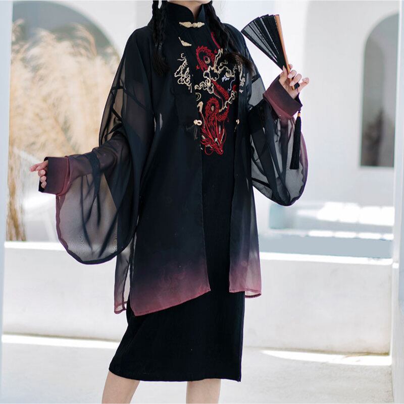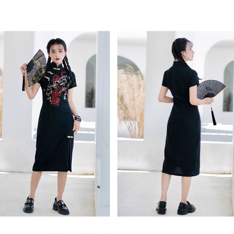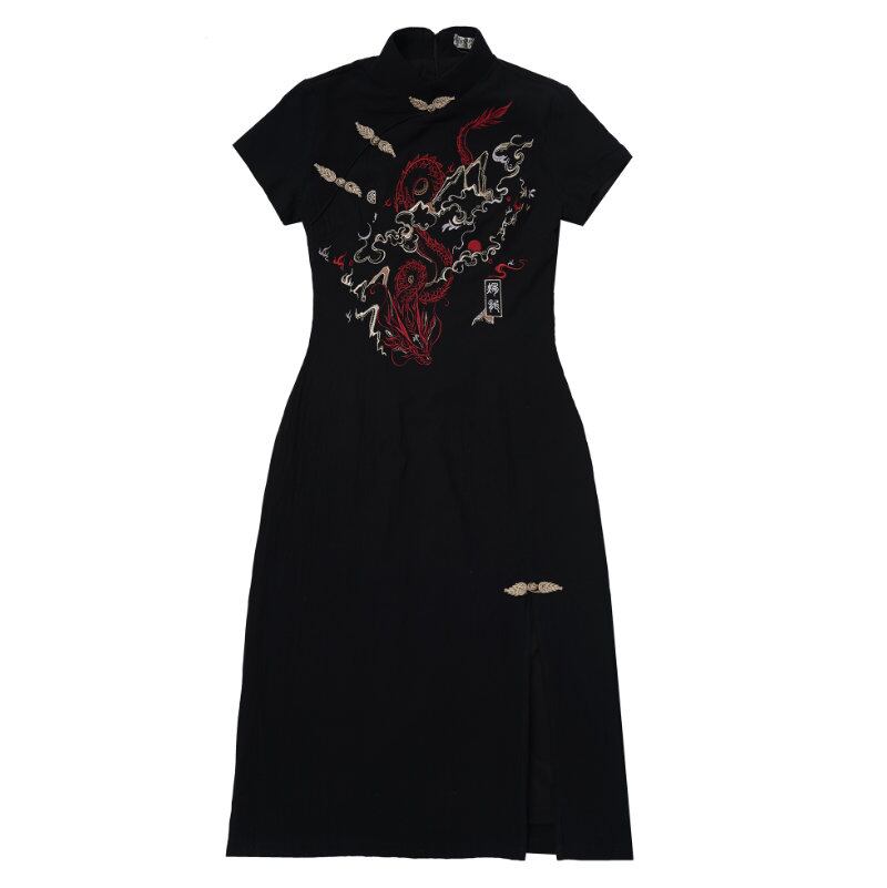 サブカル 服 地雷系 通販 チャイナドレス ひざ下丈 半袖 龍 刺繍 中華 中国 民族衣装 スリット