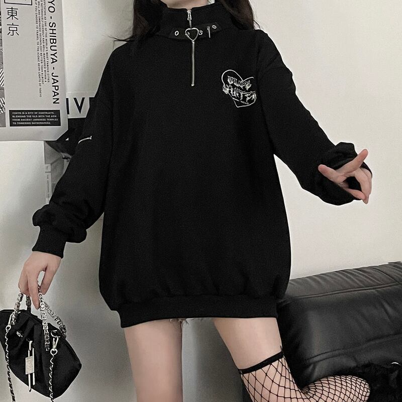 襟はZIPファスナー仕様、ハートの刺繍が病み可愛いサブカル系セーターです
