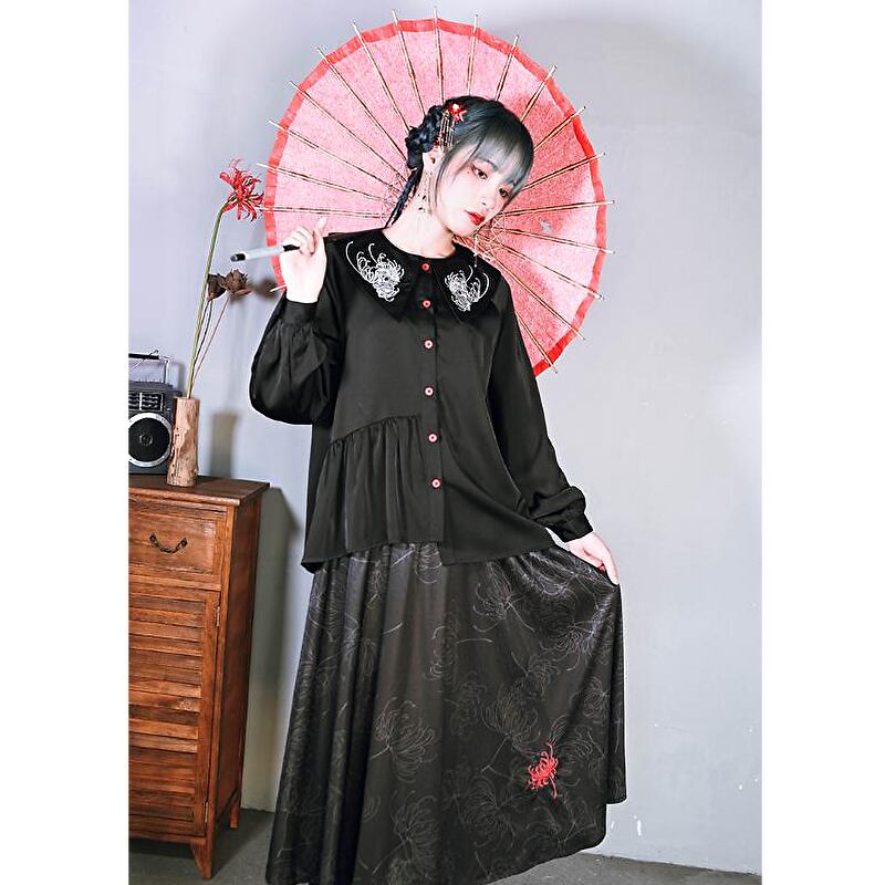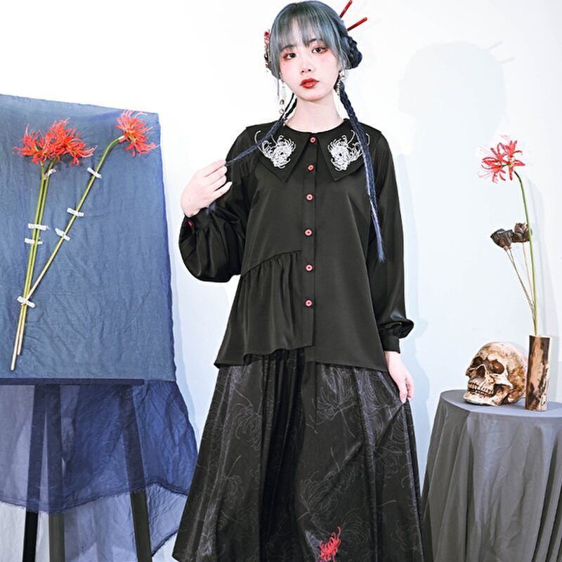 サブカル 服 地雷系 通販 チャイナ風服 チャイナ風服 古怪舎 上下セット イレギュラー 長袖シャツ ペプラム スカート 曼珠沙華 ヒガンバナ レトロ 闇かわいい 中華服 チャイナ服普段使い