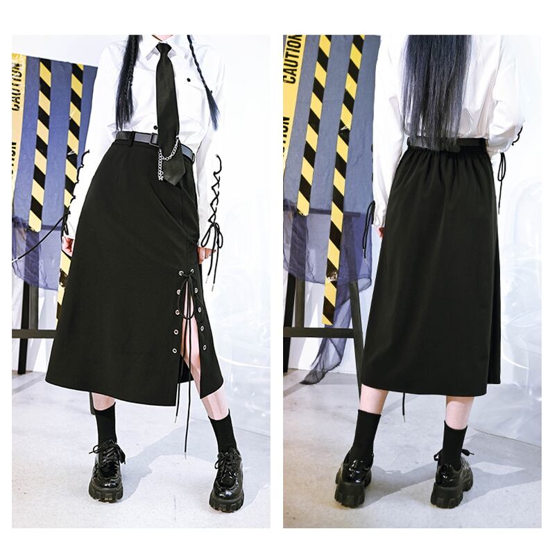 長袖シャツはチェーン付きネクタイに袖は編み上げレースアップ、スカートはほどよい着丈のミモレ丈にサイドのレースアップデザインだからトップスとトータルコーデが叶います