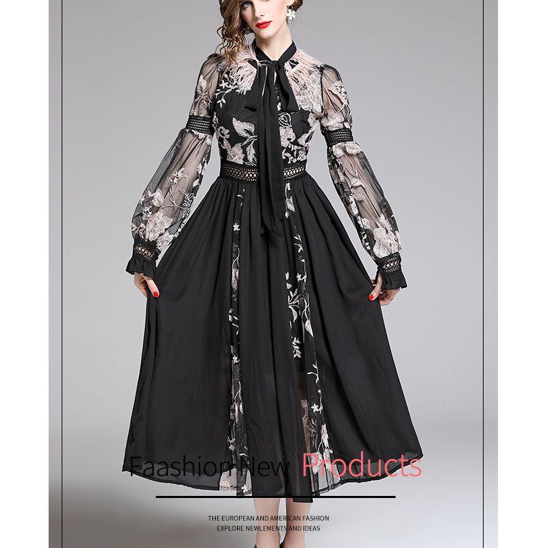 サブカル 服 地雷系 通販 モード服 ワンピース ドレス 長袖 エレガント パフスリーブ レース リボンタイ ミモレ丈 ゴシック ストリート系