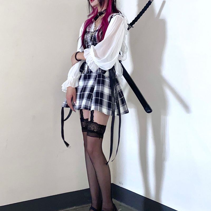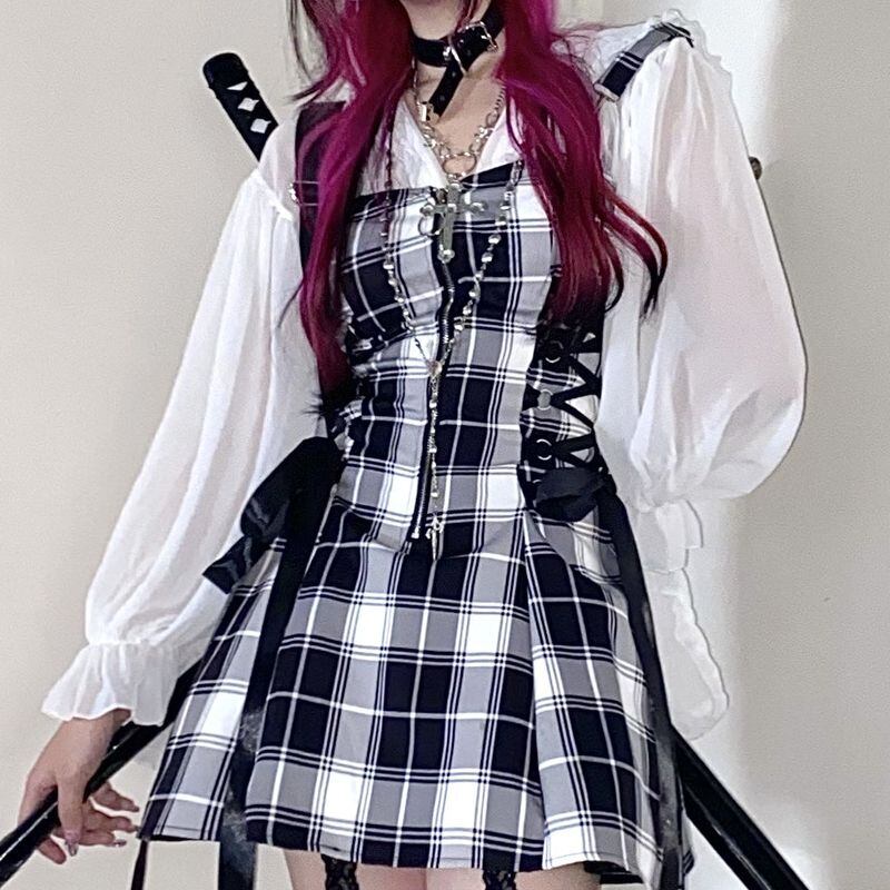 サブカル 服 地雷系 通販 ワンピース ミニ丈 チェック柄 リボン モノトーン ゴシック ジャンパースカートバンギャ