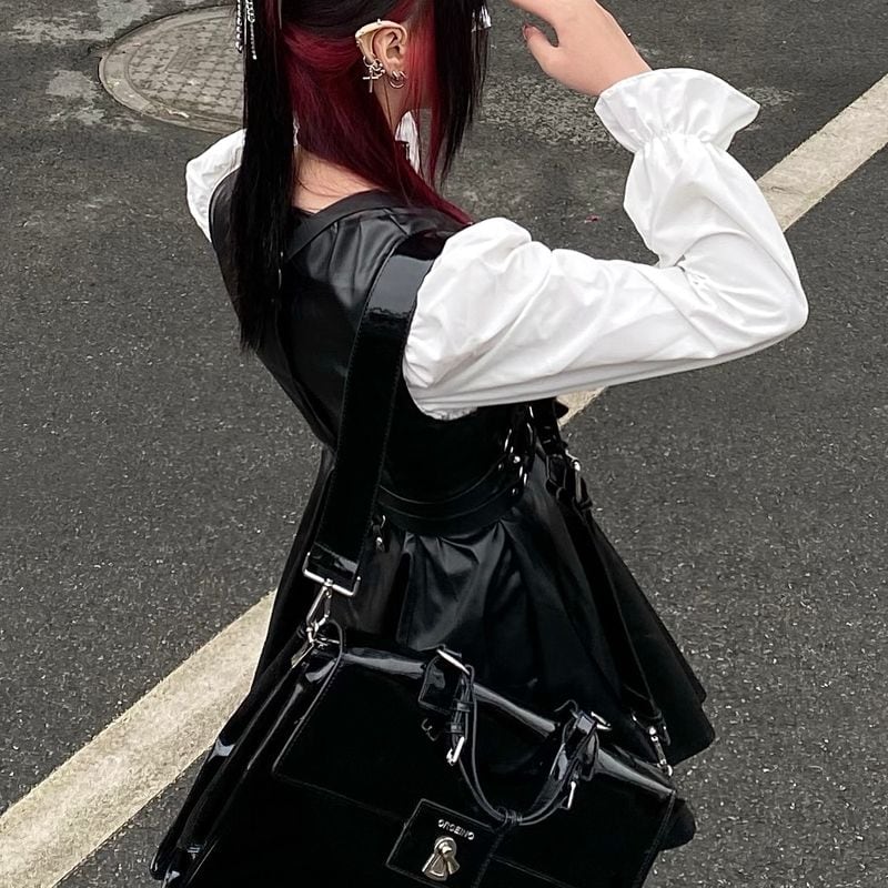 PUレザー製のミニ丈コルセットジャンパースカートです。