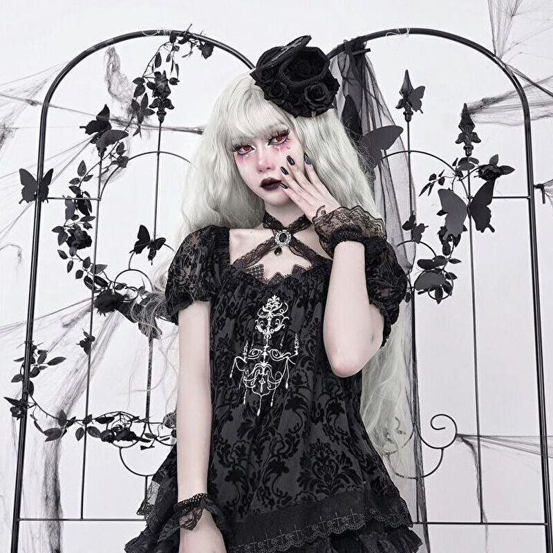 サブカル 服 地雷系 通販 シャツ 半袖 レース パフスリーブ シアー素材 ゴシックシャンデリア プリント ネックストラップ