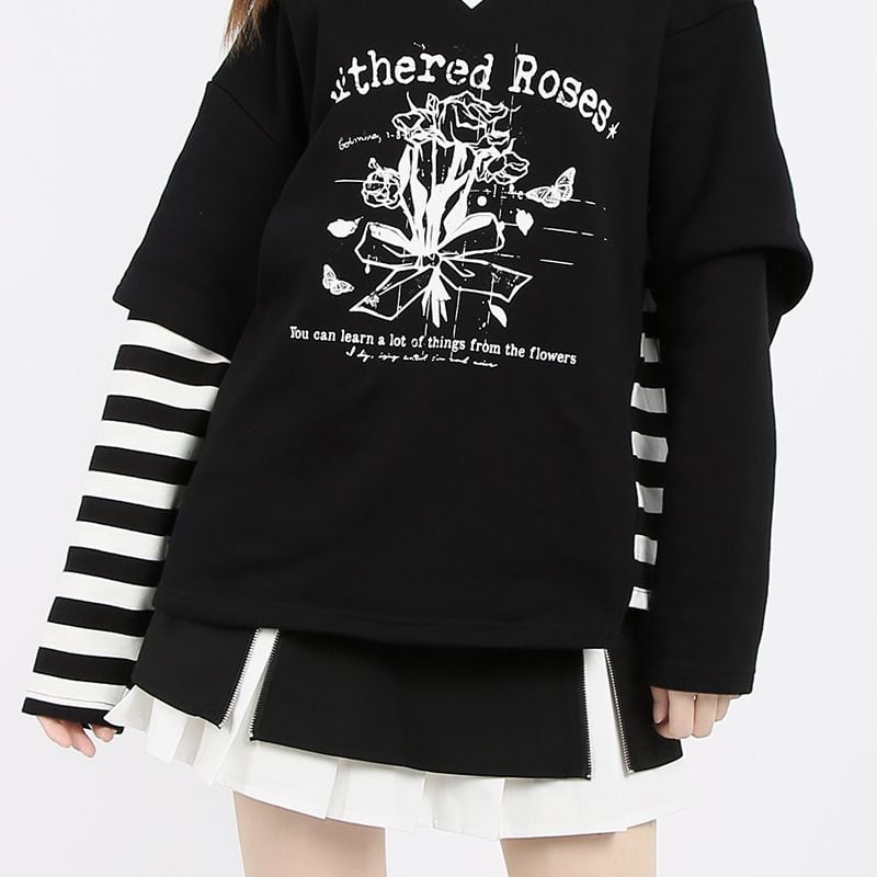 バラのイラストと英字がプリントされた重ね着風アシンメトリ長袖シャツ